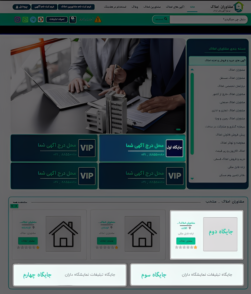 این جایگاه ویژه مشاوران املاک یا شرکتهای فعال در حوزه املاک است که قصد دارند با فرمت تصویر ثابت یا متحرک به معرفی کسبوکار خود بپردازند.